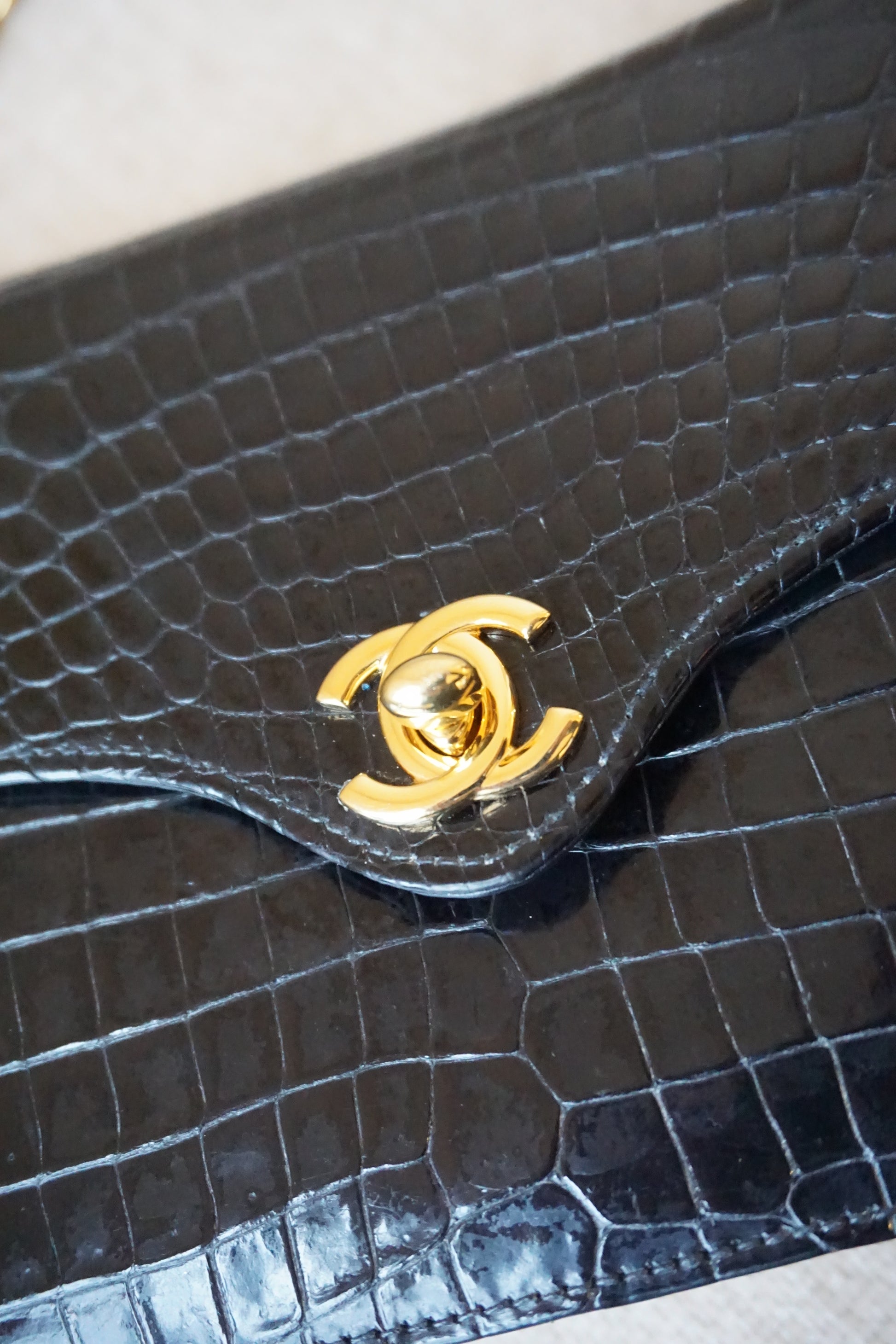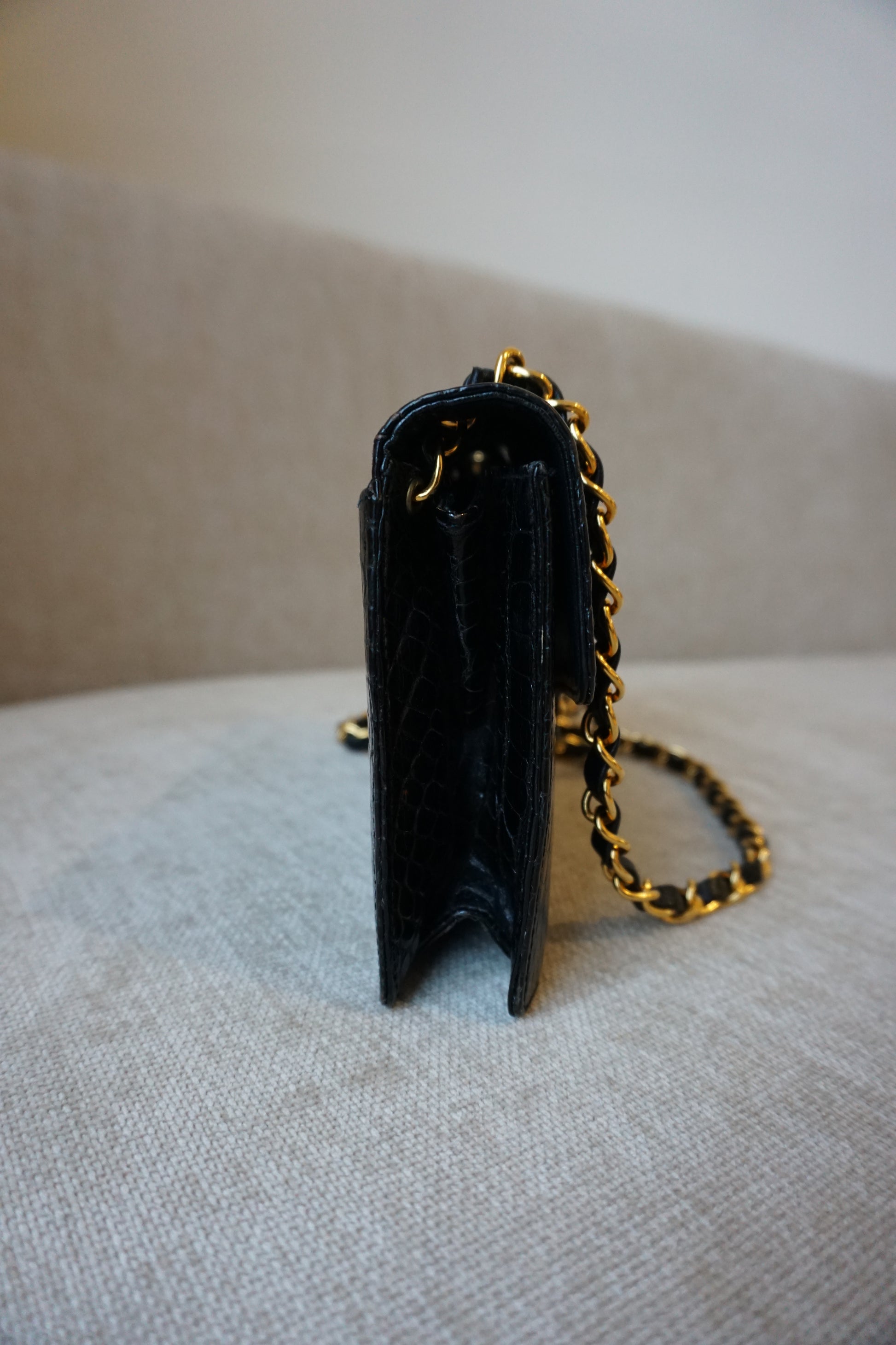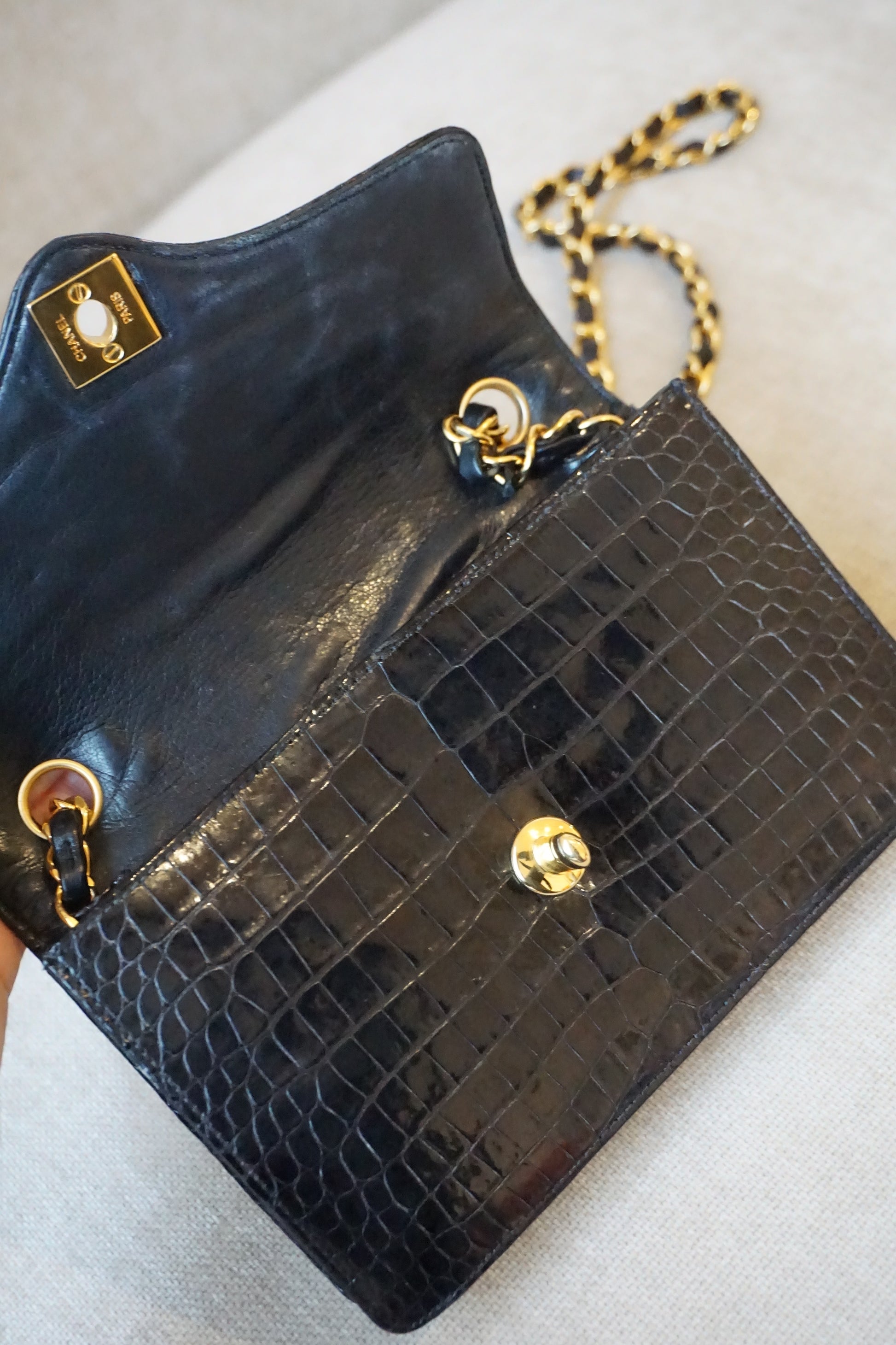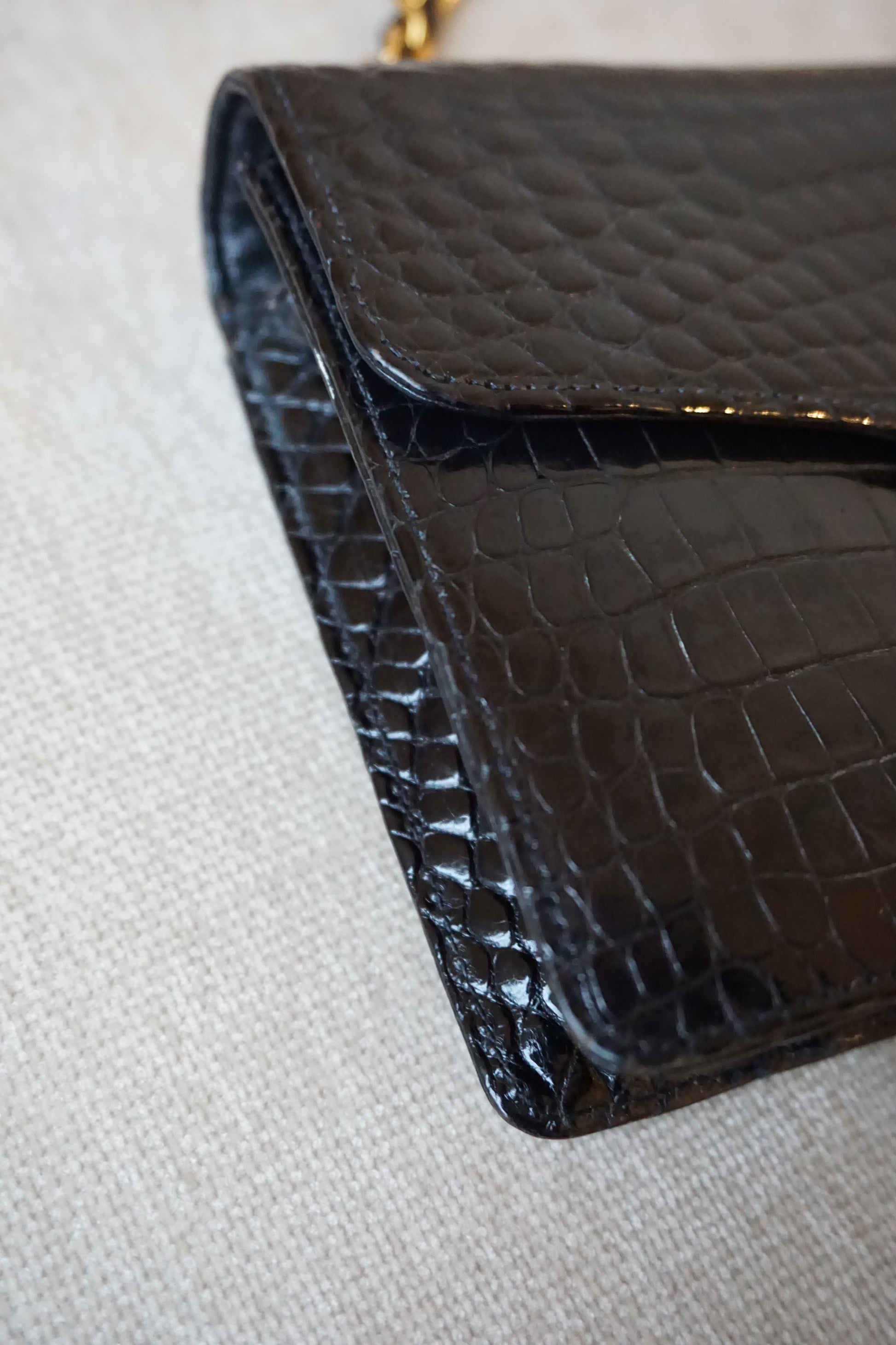Pre-Loved Vintage Chanel Mini Single Flap in Black Shiny Croc. Comes with it's white Chanel Rue Cambon box, dustbag, and Chanel Spa Receipt (2023) the hardware was replaced and looks absolutely stunning. This bag is vintage but in lovely condition and is such a rare bag! Some minor corner wear and interior marks. The perfect size, any iphone should fit. **Due to it being an exotic leather, shipping is only possible in the EU, if you are located elsewhere and interested in this bag, please email me**
