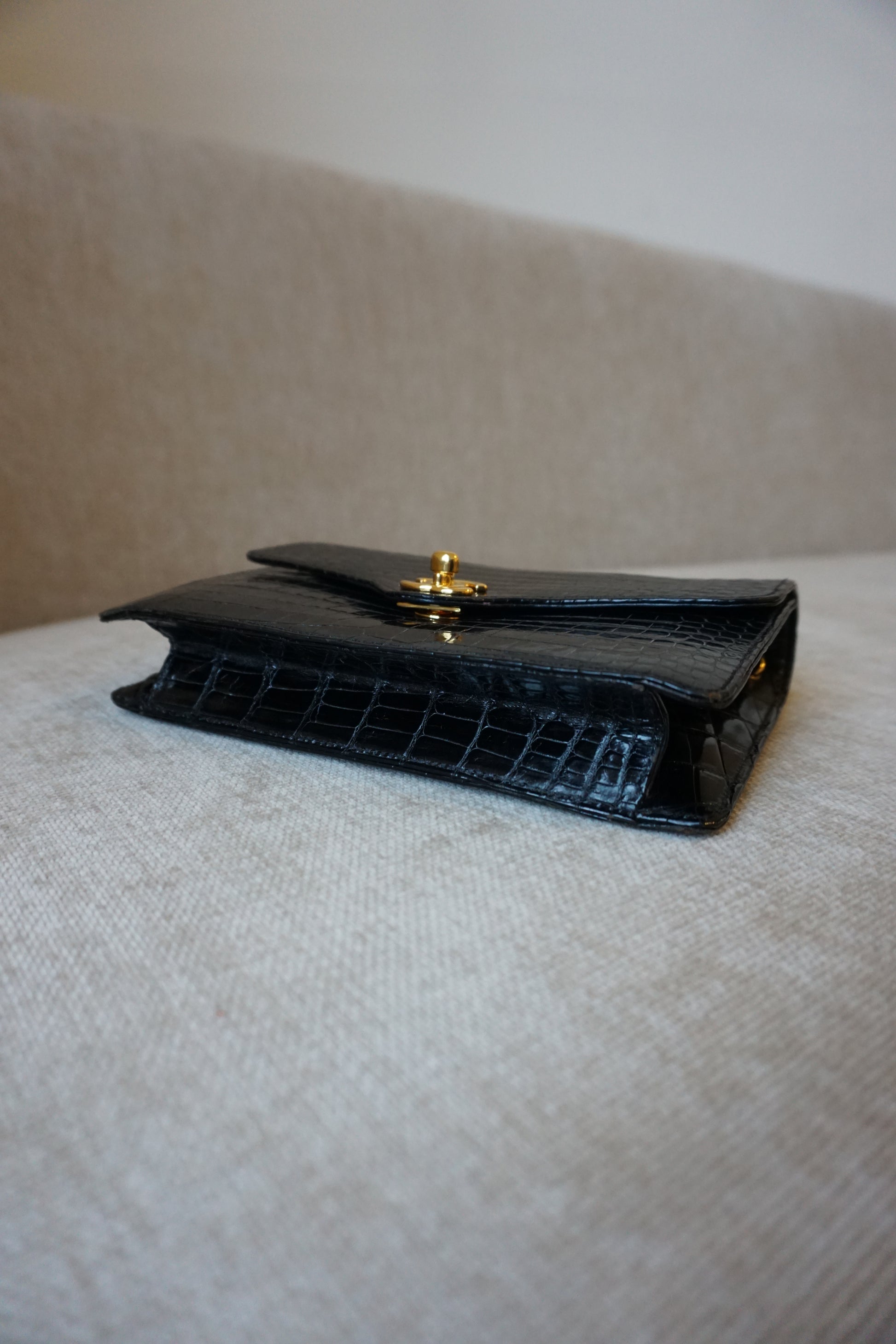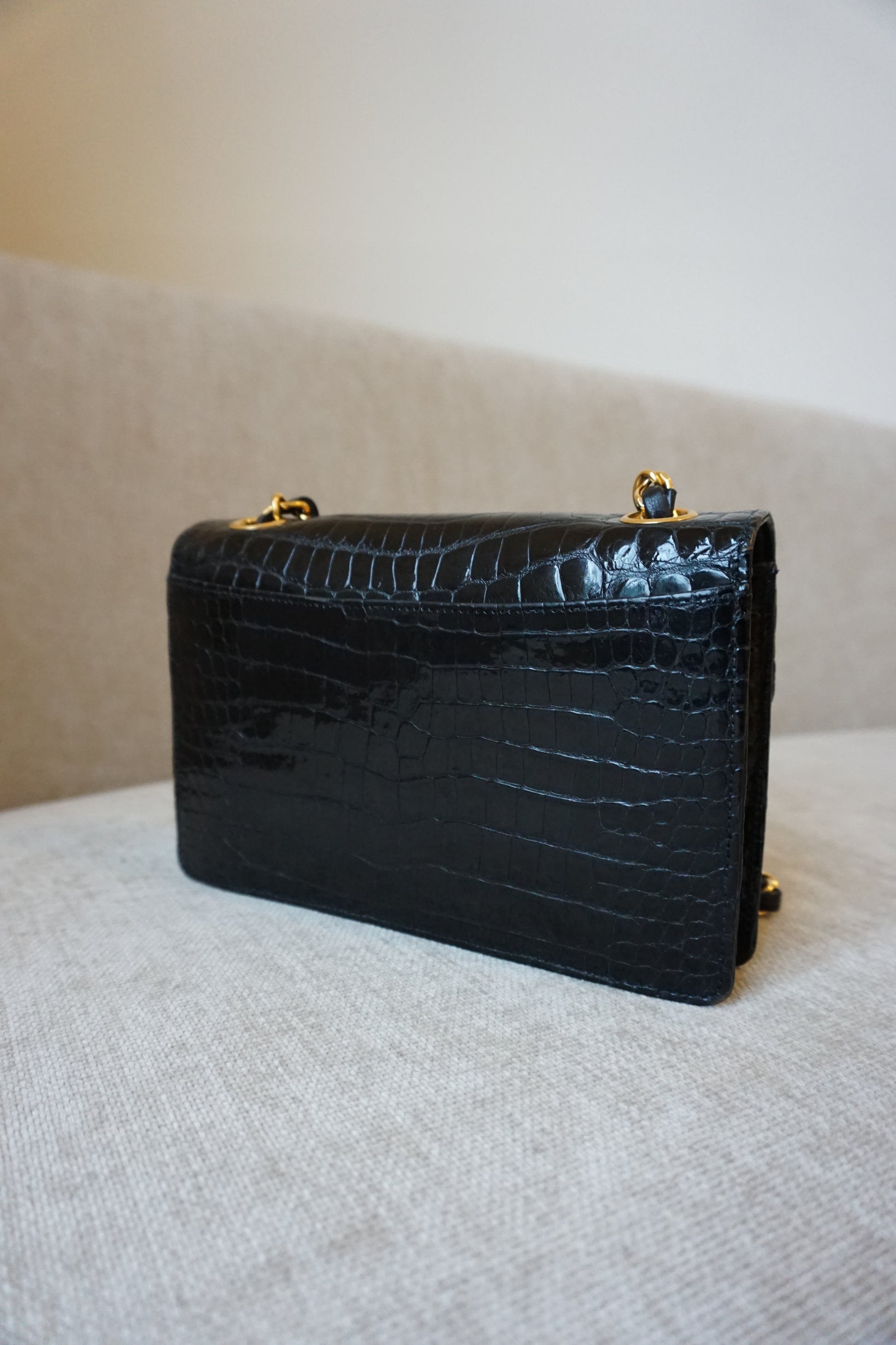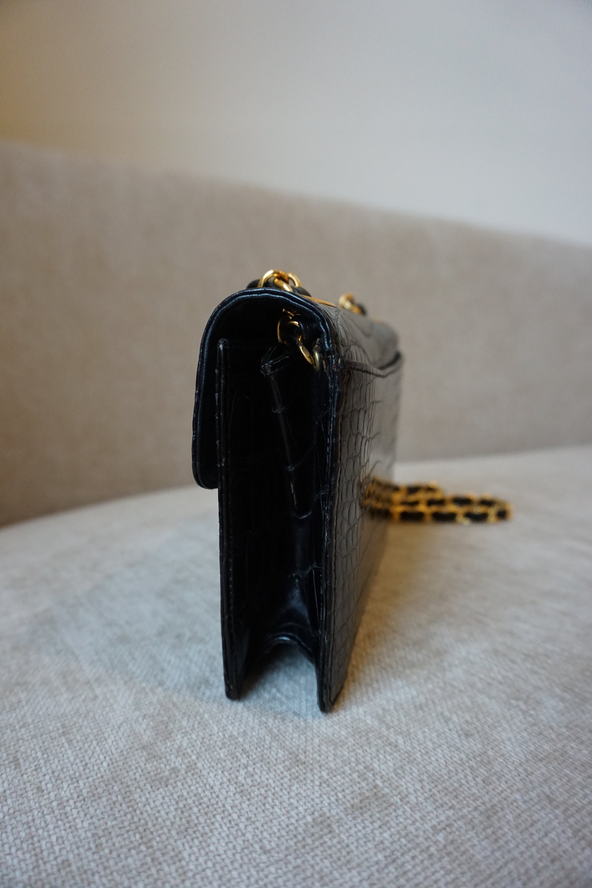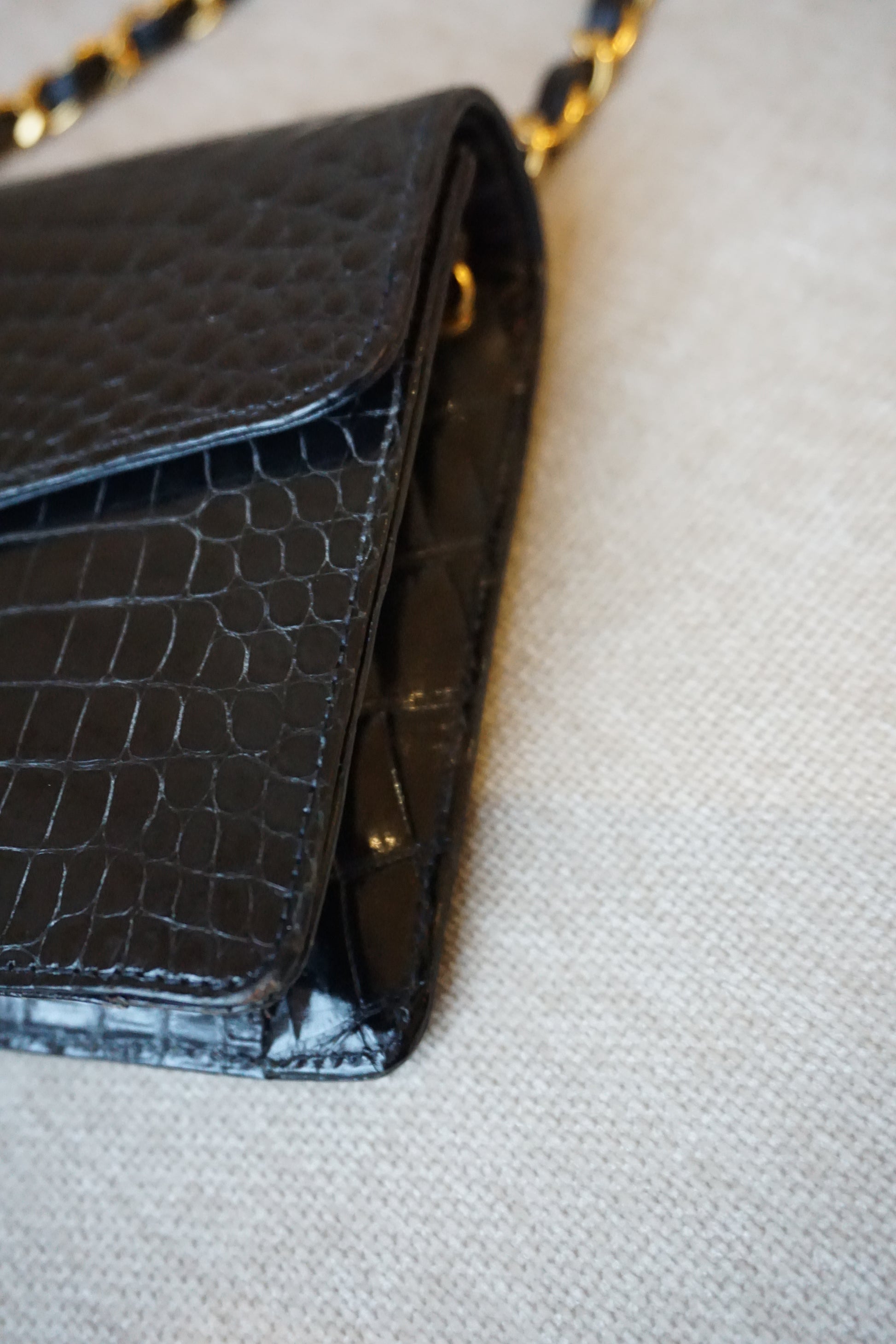 Pre-Loved Vintage Chanel Mini Single Flap in Black Shiny Croc. Comes with it's white Chanel Rue Cambon box, dustbag, and Chanel Spa Receipt (2023) the hardware was replaced and looks absolutely stunning. This bag is vintage but in lovely condition and is such a rare bag! Some minor corner wear and interior marks. The perfect size, any iphone should fit. **Due to it being an exotic leather, shipping is only possible in the EU, if you are located elsewhere and interested in this bag, please email me**