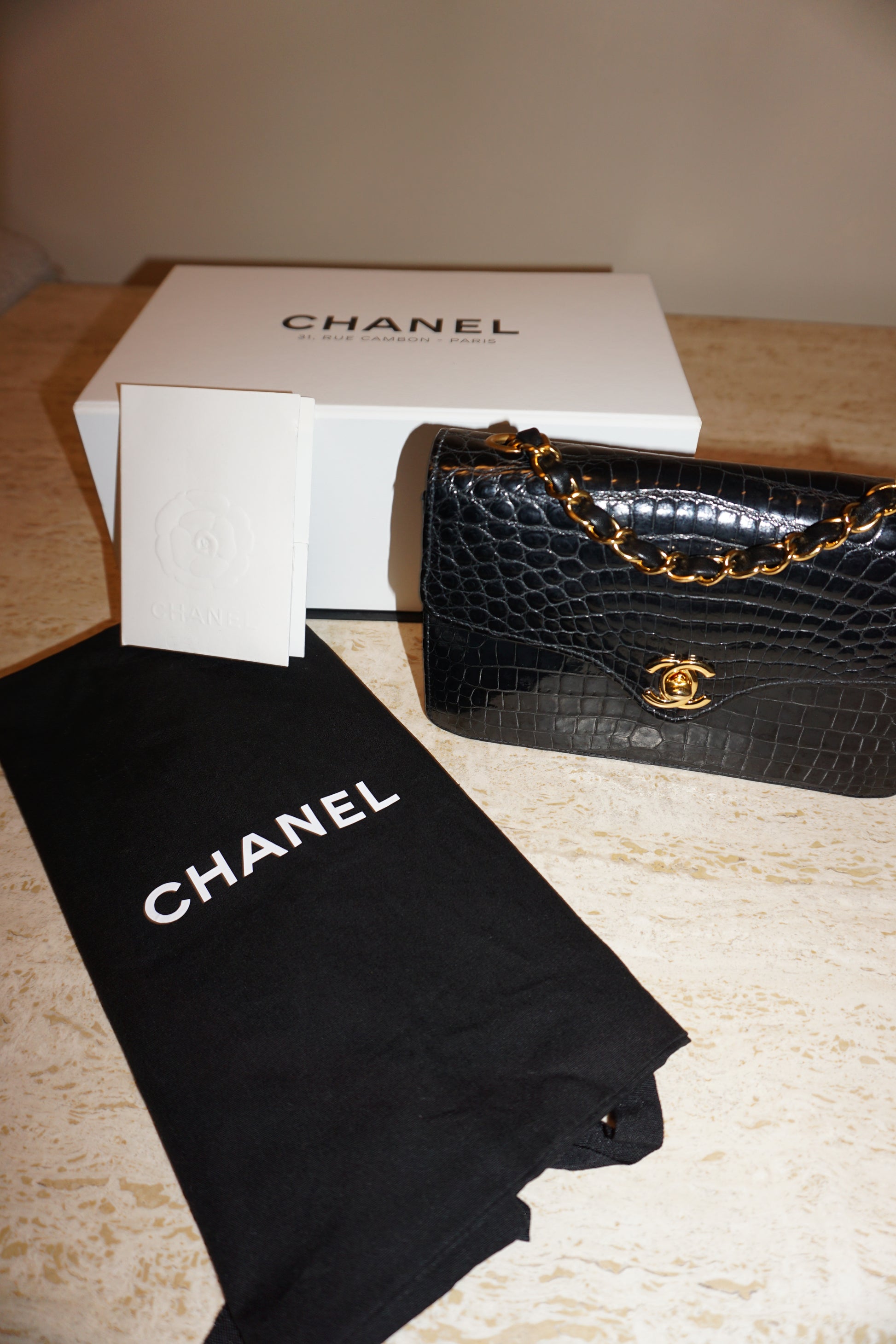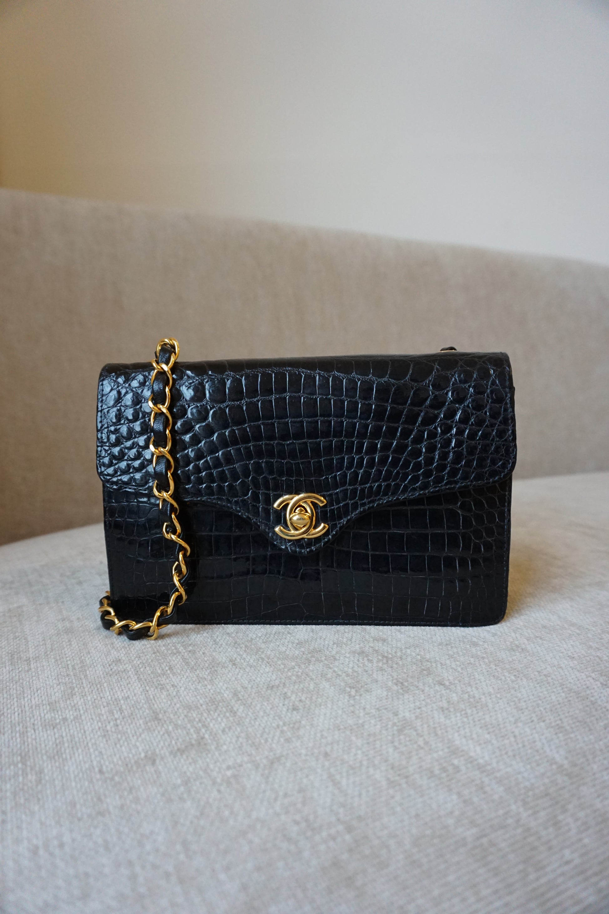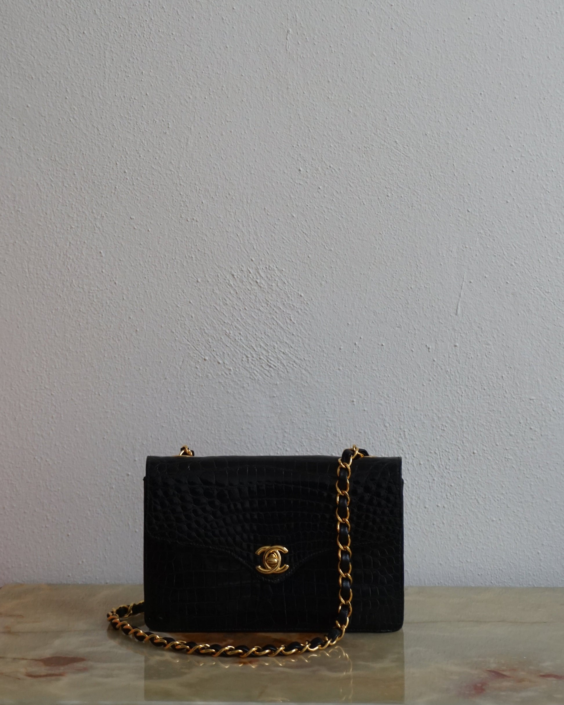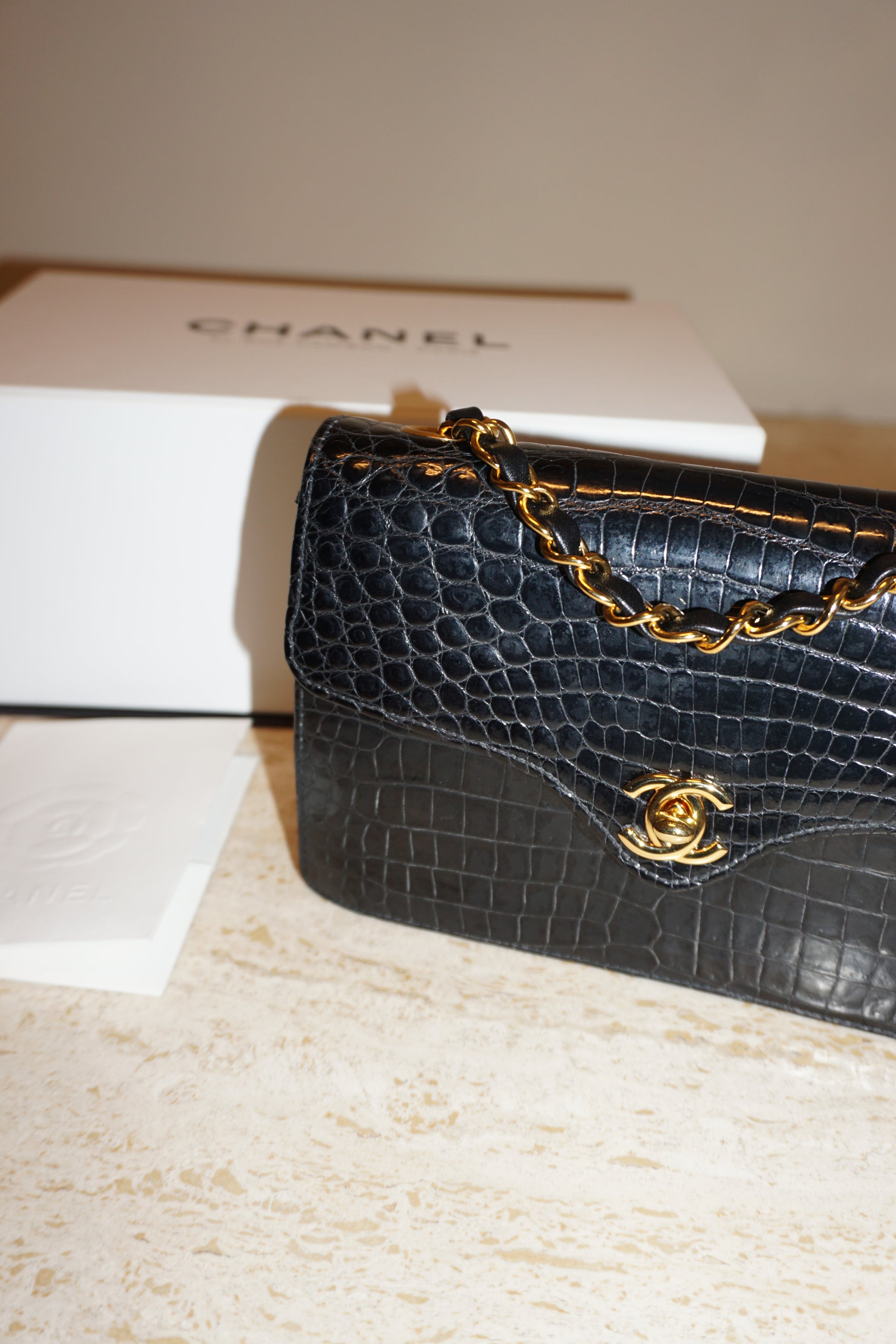 Pre-Loved Vintage Chanel Mini Single Flap in Black Shiny Croc. Comes with it's white Chanel Rue Cambon box, dustbag, and Chanel Spa Receipt (2023) the hardware was replaced and looks absolutely stunning. This bag is vintage but in lovely condition and is such a rare bag! Some minor corner wear and interior marks. The perfect size, any iphone should fit. **Due to it being an exotic leather, shipping is only possible in the EU, if you are located elsewhere and interested in this bag, please email me**