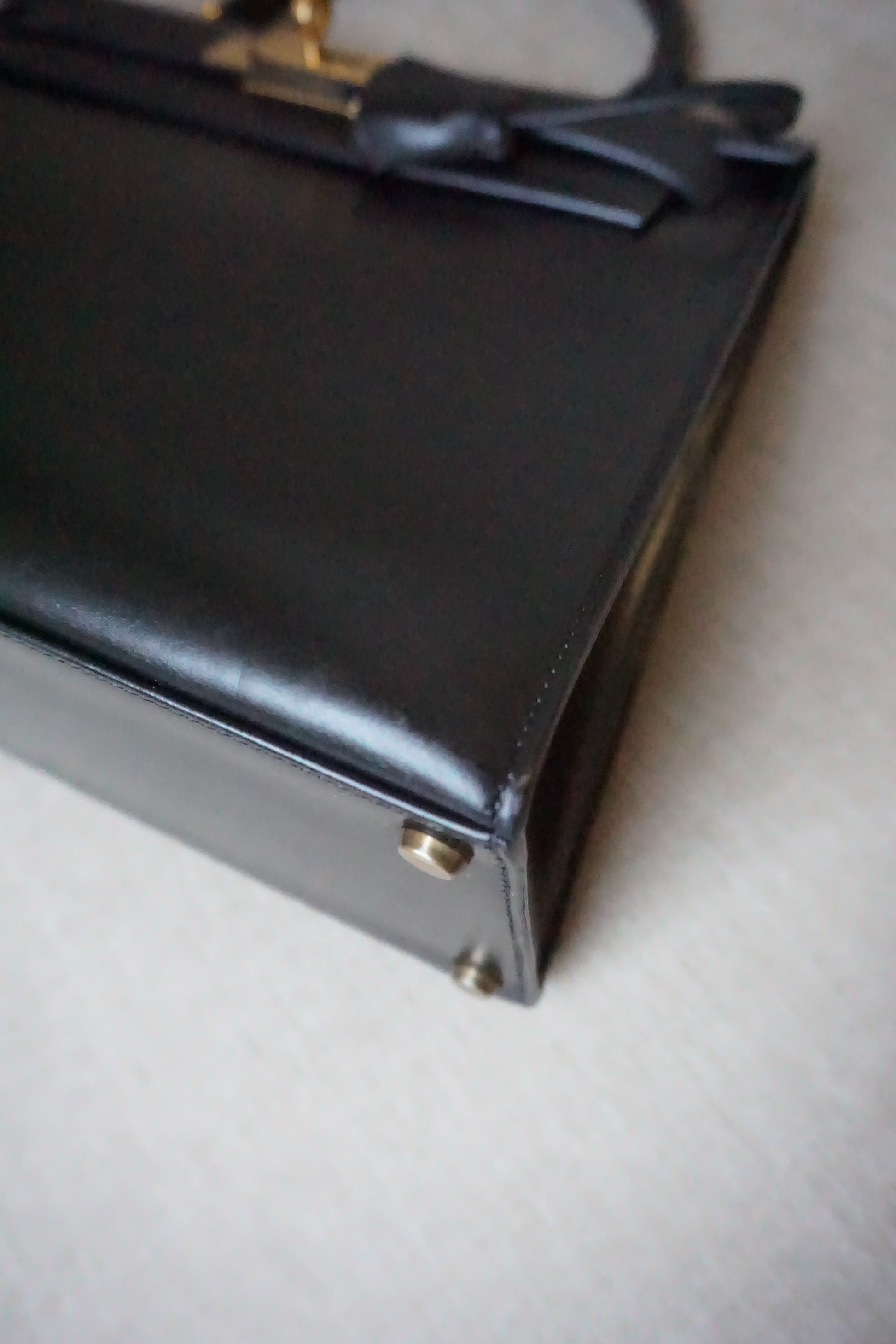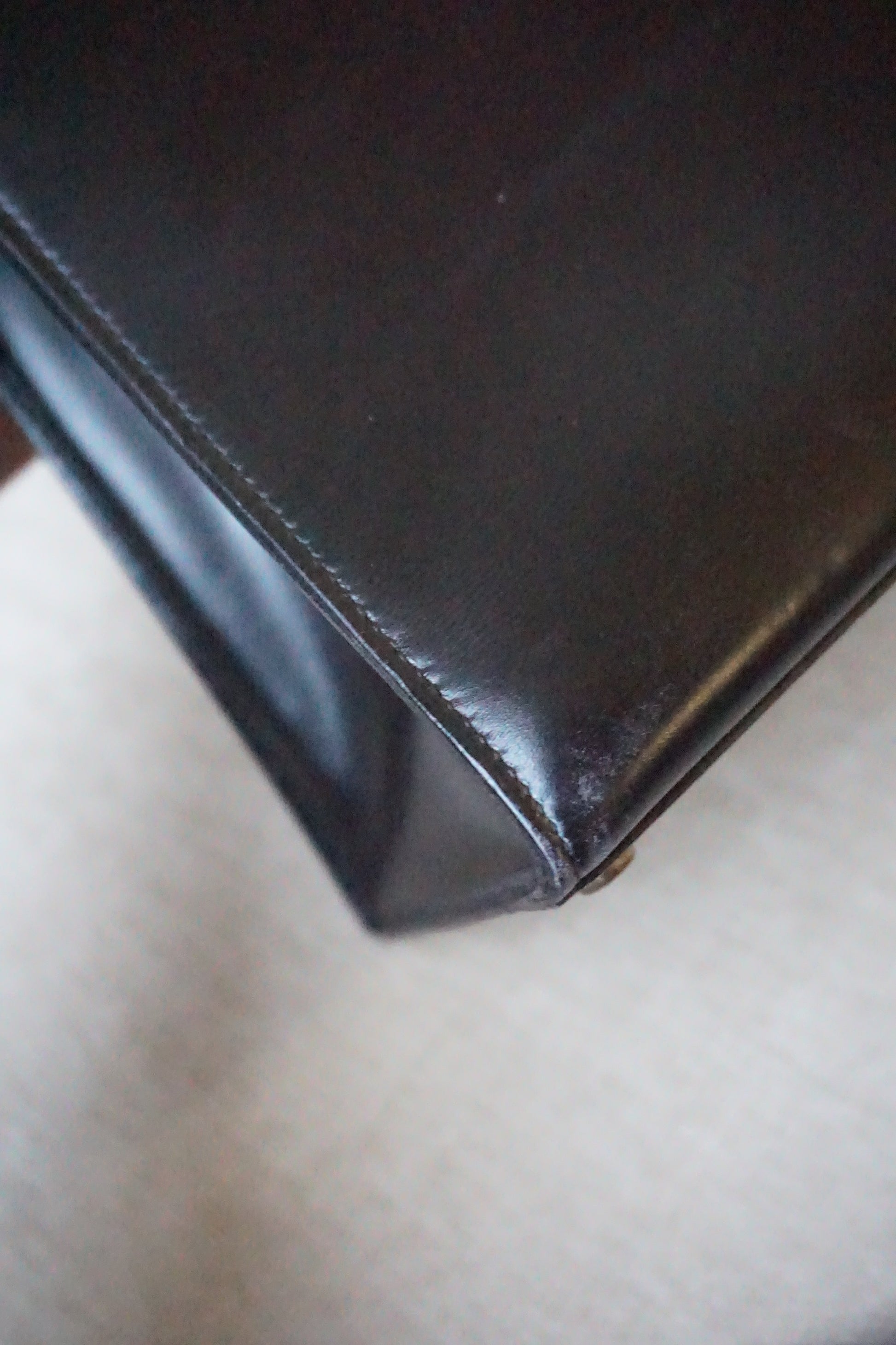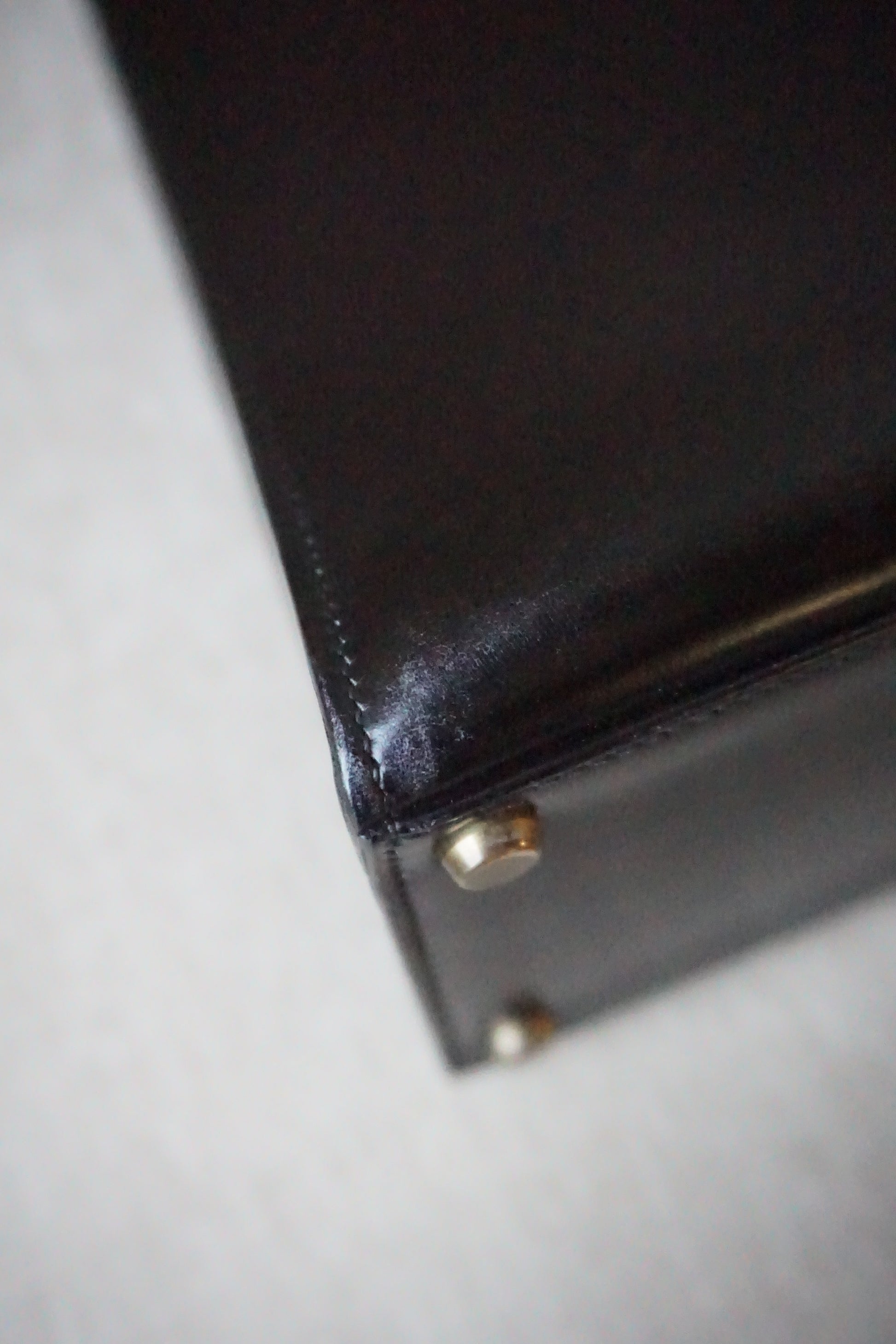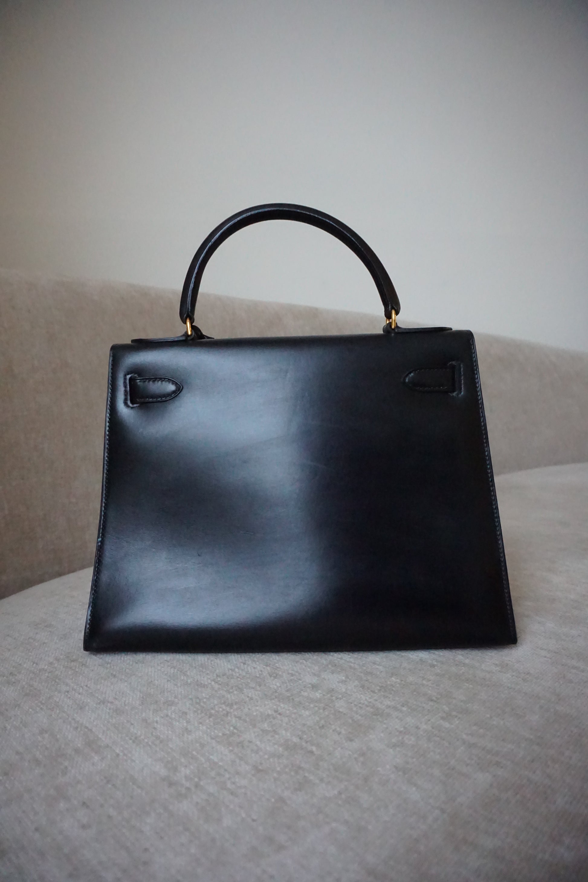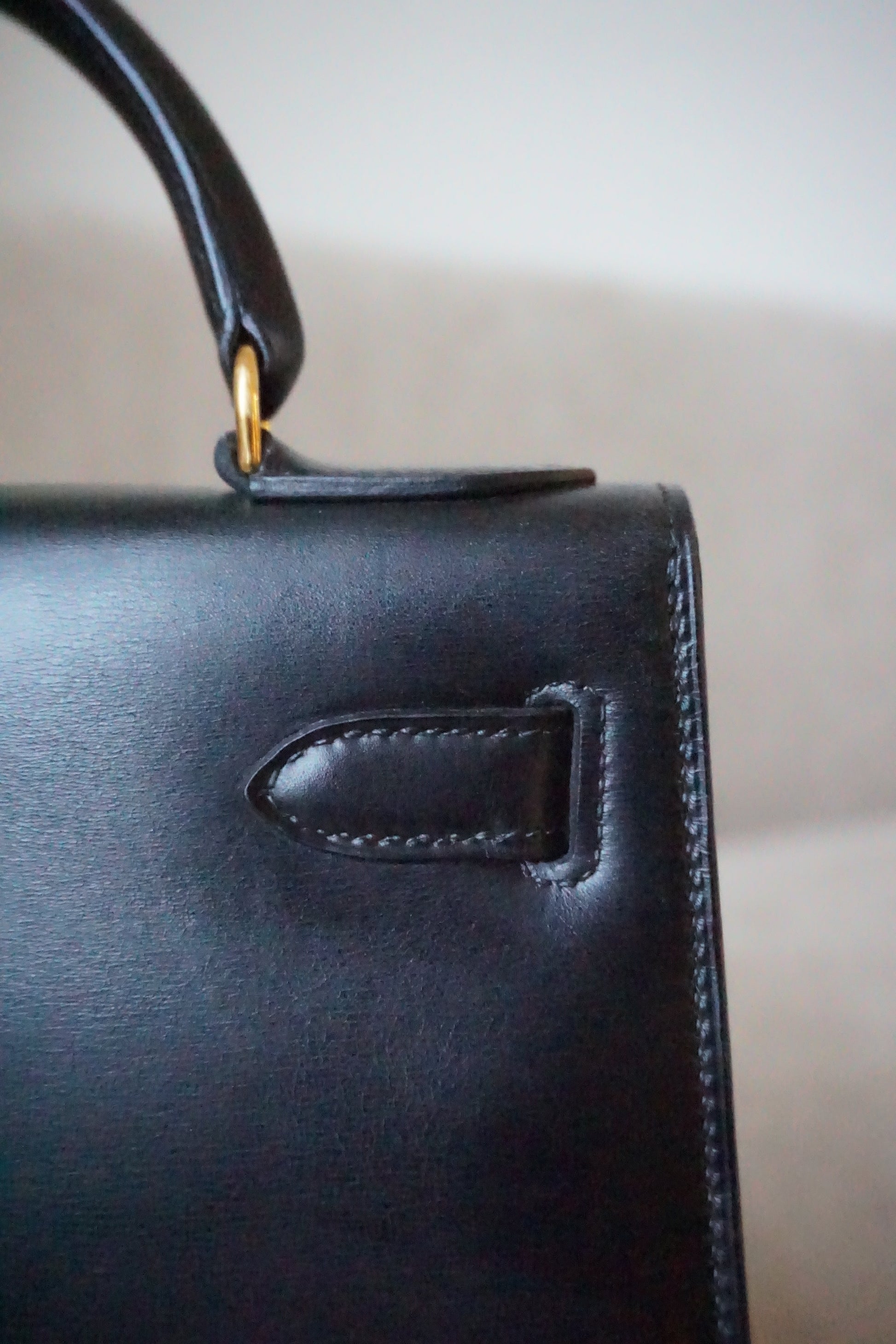 Pre Loved Hermès Sellier Kelly 28 Black Box Calf Leather with Gold Hardware. Comes with strap, clochette, keys, lock, dustbag, and Certificate of Authenticity. The stamp is a Circle I (1975). The bag has some very minor exterior scratches and wear to the corners. Hairline scratches on the hardware and interior. Overall this bag is in amazing pre loved condition given its age.